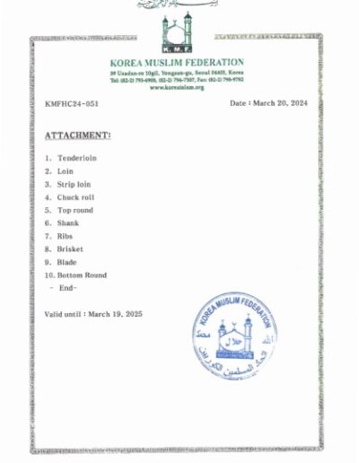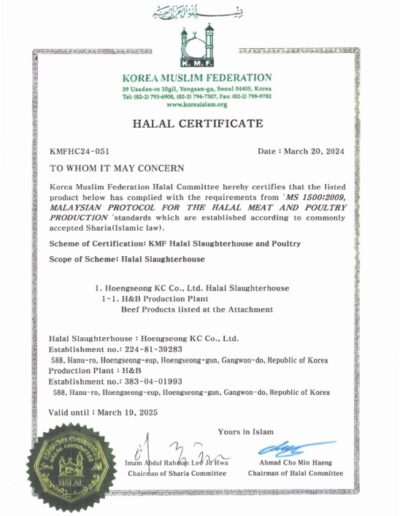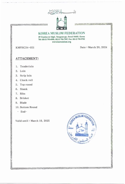 사업소개 시설안내 도축 부분육 가공 부산물 가공 한우도매유통 직영판매장 HALAL 한우 생산 HALAL 한우 생산 한국 무슬림 연합(KMF)으로부터 HALAL 자격을 취득하여 HALAL 소고기를 생산 하고 있습니다.